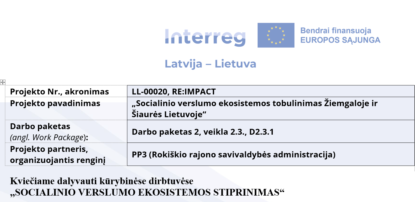 Praktiniai mokymai apimant rinkodarą ir komunikaciją, socialinio poveikio matavimą, finansavimo galimybes, partnerystės plėtrą, inovatyvius verslo modelius bei socialines inovacijas.